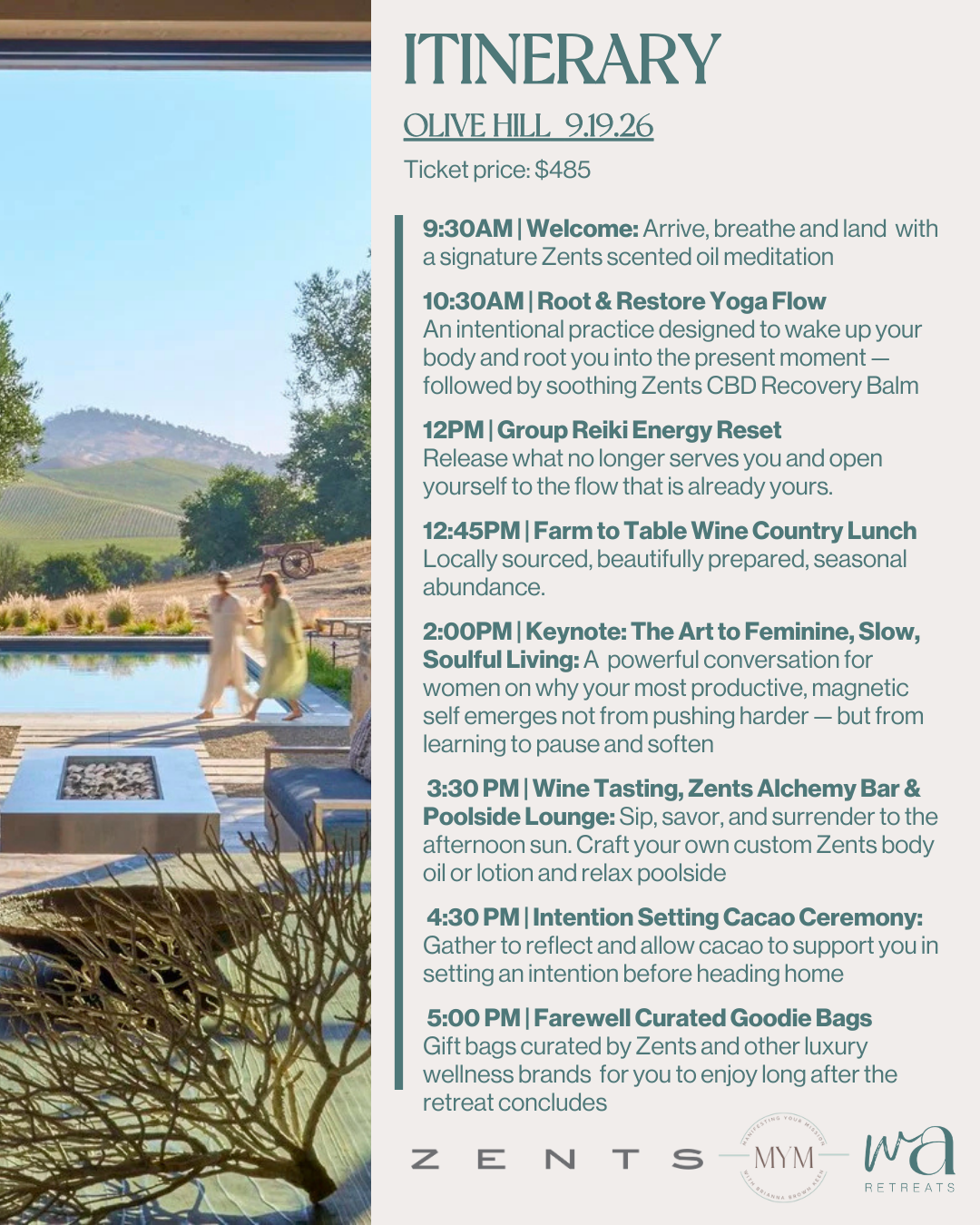 Day one unfolds at the breathtaking Olive Hill Estate — a private hillside sanctuary where each element is intentionally curated to restore both body and mind. Through meditation, strength-based yoga enhanced with Zents botanical oils and balms, group Reiki energy healing, and a thoughtfully led workshop on feminine intentional living, you are invited to recalibrate your energy. The day is complemented by a seasonal farm-to-table lunch, a hands-on Zents alchemy experience, and a closing cacao intention-setting ceremony designed to anchor a more grounded, expansive way of moving through life.